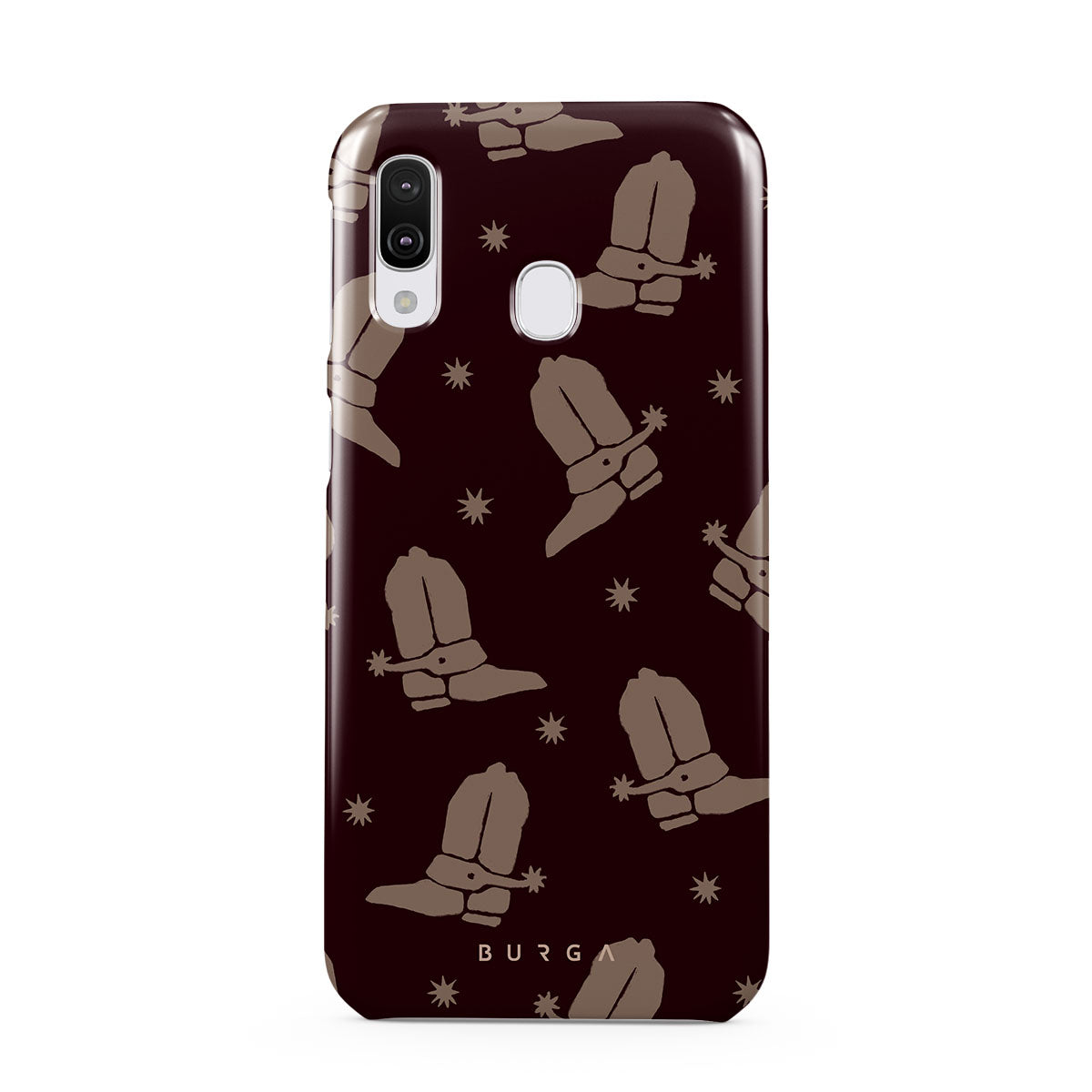 Say Howdy to this charming Samsung Galaxy A40 phone case design. Cowboy boots and stars dance across a deep brown background, celebrating the essence of western life. Perfect for those who embrace their free spirit.