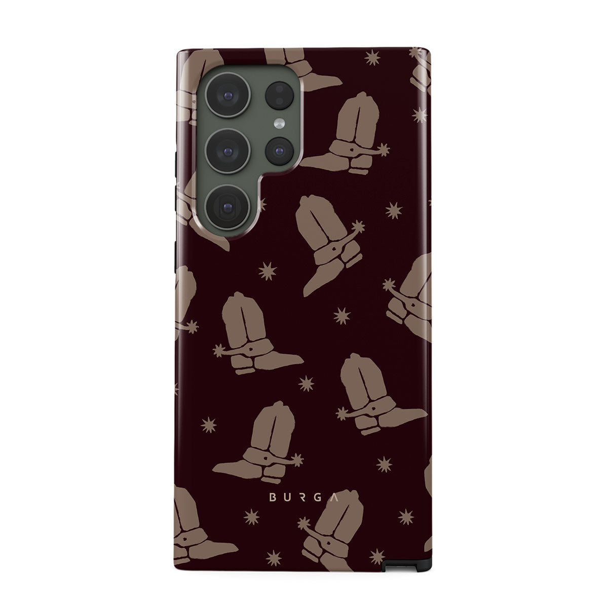 Say Howdy to this charming Samsung Galaxy S23 Ultra phone case design. Cowboy boots and stars dance across a deep brown background, celebrating the essence of western life. Perfect for those who embrace their free spirit.
