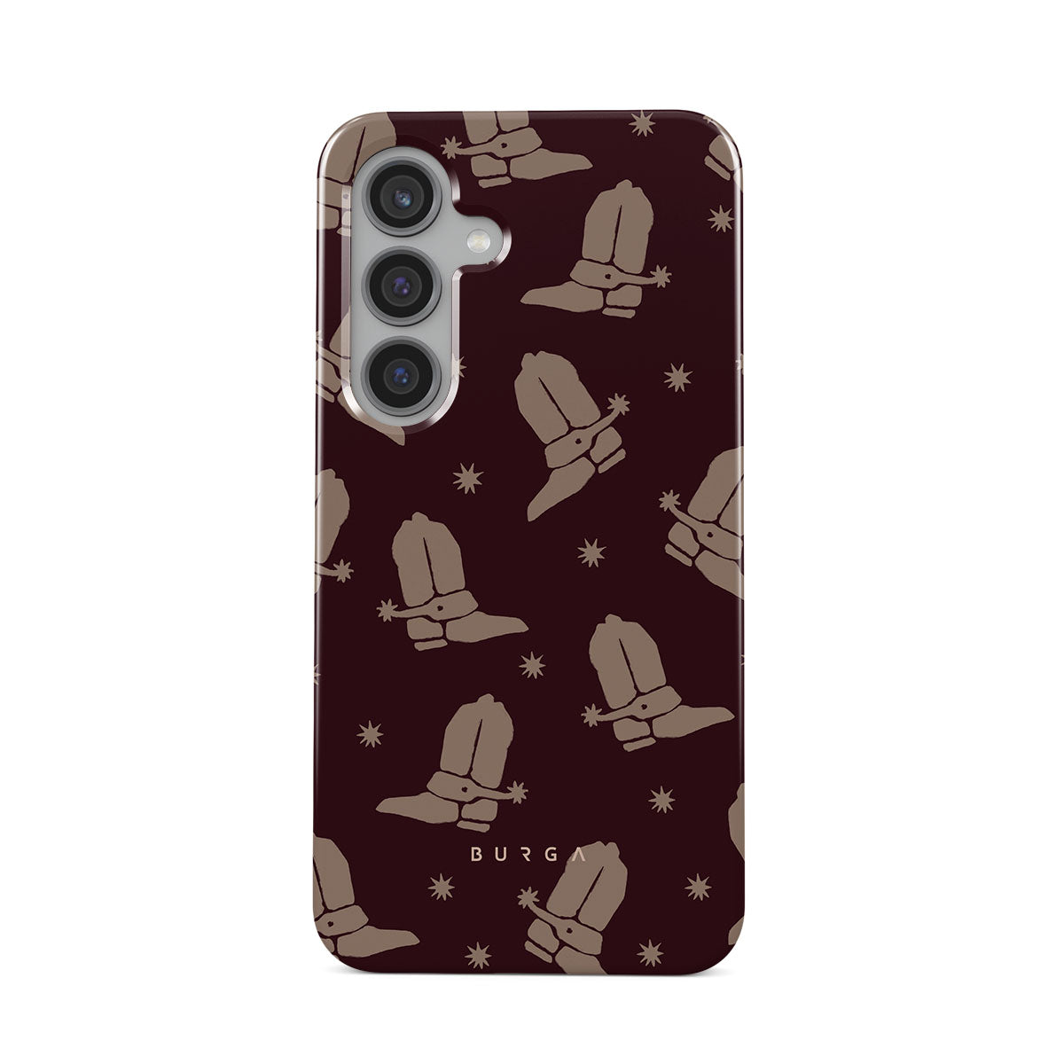 Say Howdy to this charming Samsung Galaxy S24 FE phone case design. Cowboy boots and stars dance across a deep brown background, celebrating the essence of western life. Perfect for those who embrace their free spirit.