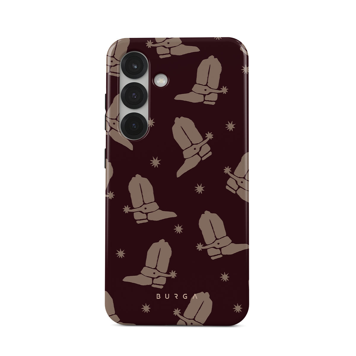Say Howdy to this charming Samsung Galaxy S25 Plus phone case design. Cowboy boots and stars dance across a deep brown background, celebrating the essence of western life. Perfect for those who embrace their free spirit.