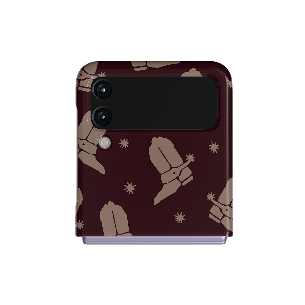Say Howdy to this charming Samsung Galaxy Z Flip 4 phone case design. Cowboy boots and stars dance across a deep brown background, celebrating the essence of western life. Perfect for those who embrace their free spirit.