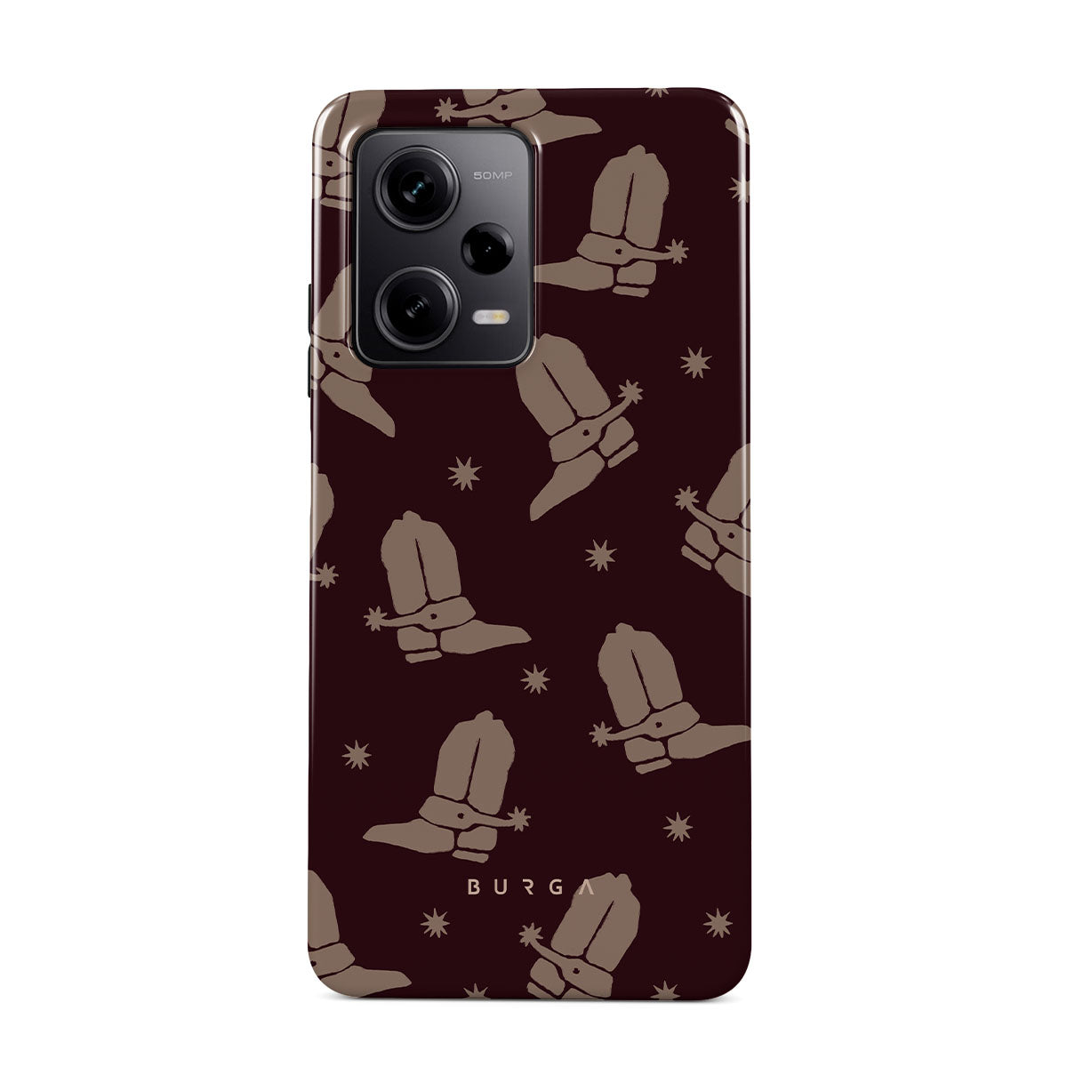 Say Howdy to this charming Xiaomi Redmi Note 12 Pro 5G phone case design. Cowboy boots and stars dance across a deep brown background, celebrating the essence of western life. Perfect for those who embrace their free spirit.