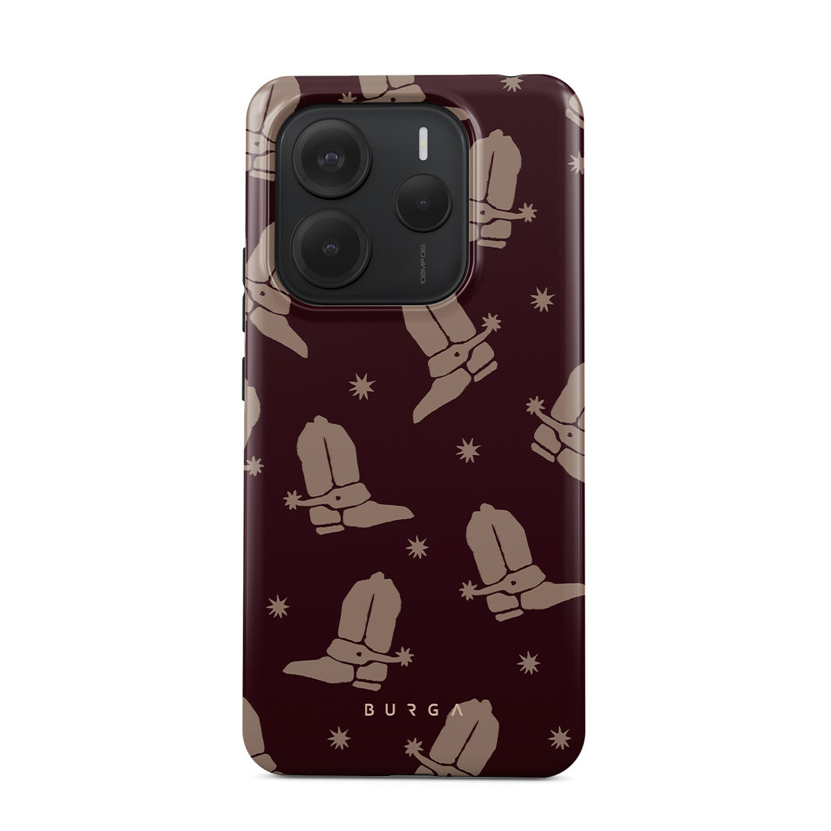 Say Howdy to this charming Xiaomi Redmi Note 14 5G phone case design. Cowboy boots and stars dance across a deep brown background, celebrating the essence of western life. Perfect for those who embrace their free spirit.