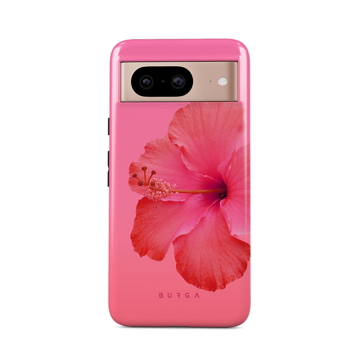 Our Island Girl Google Pixel 8 phone case design bursts with the fiery red of a hibiscus in full bloom against a dreamy pink backdrop. Perfect for those who embody the spirit of a sun-kissed island retreat.