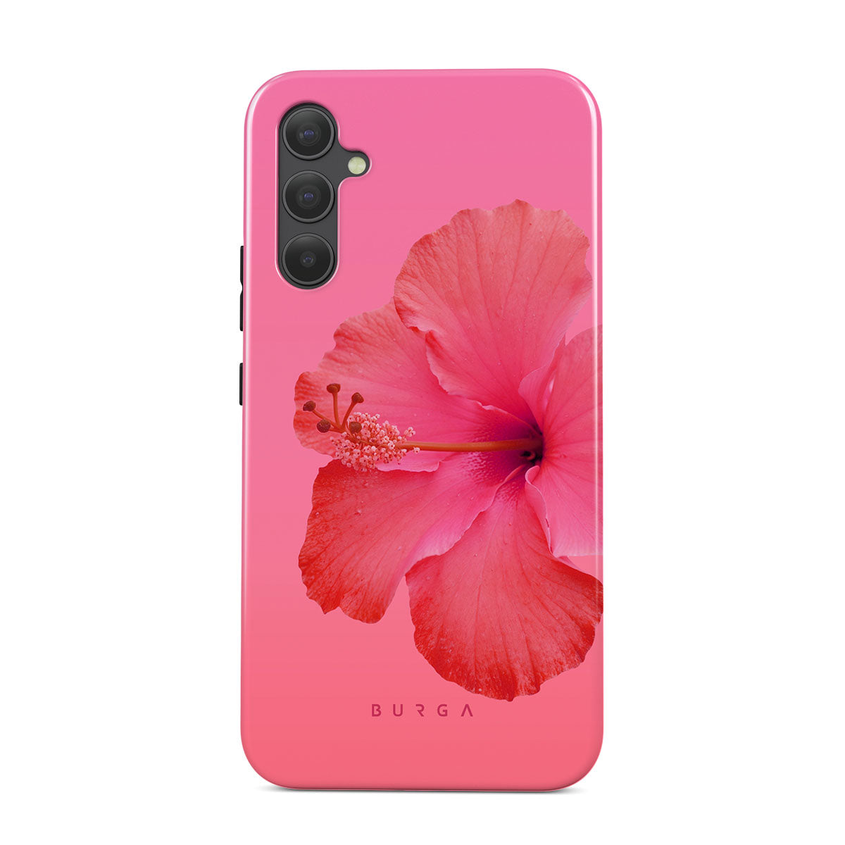 Our Island Girl Samsung Galaxy A34 phone case design bursts with the fiery red of a hibiscus in full bloom against a dreamy pink backdrop. Perfect for those who embody the spirit of a sun-kissed island retreat.