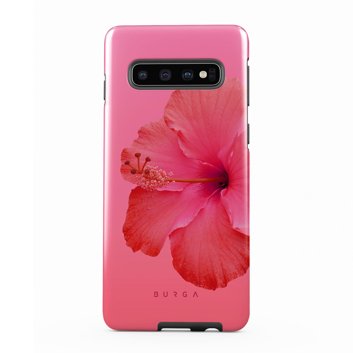 Our Island Girl Samsung Galaxy S10 4G phone case design bursts with the fiery red of a hibiscus in full bloom against a dreamy pink backdrop. Perfect for those who embody the spirit of a sun-kissed island retreat.