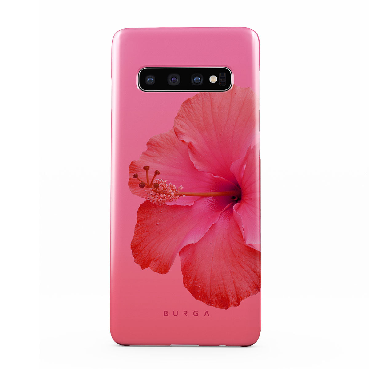 Our Island Girl Samsung Galaxy S10 Plus phone case design bursts with the fiery red of a hibiscus in full bloom against a dreamy pink backdrop. Perfect for those who embody the spirit of a sun-kissed island retreat.