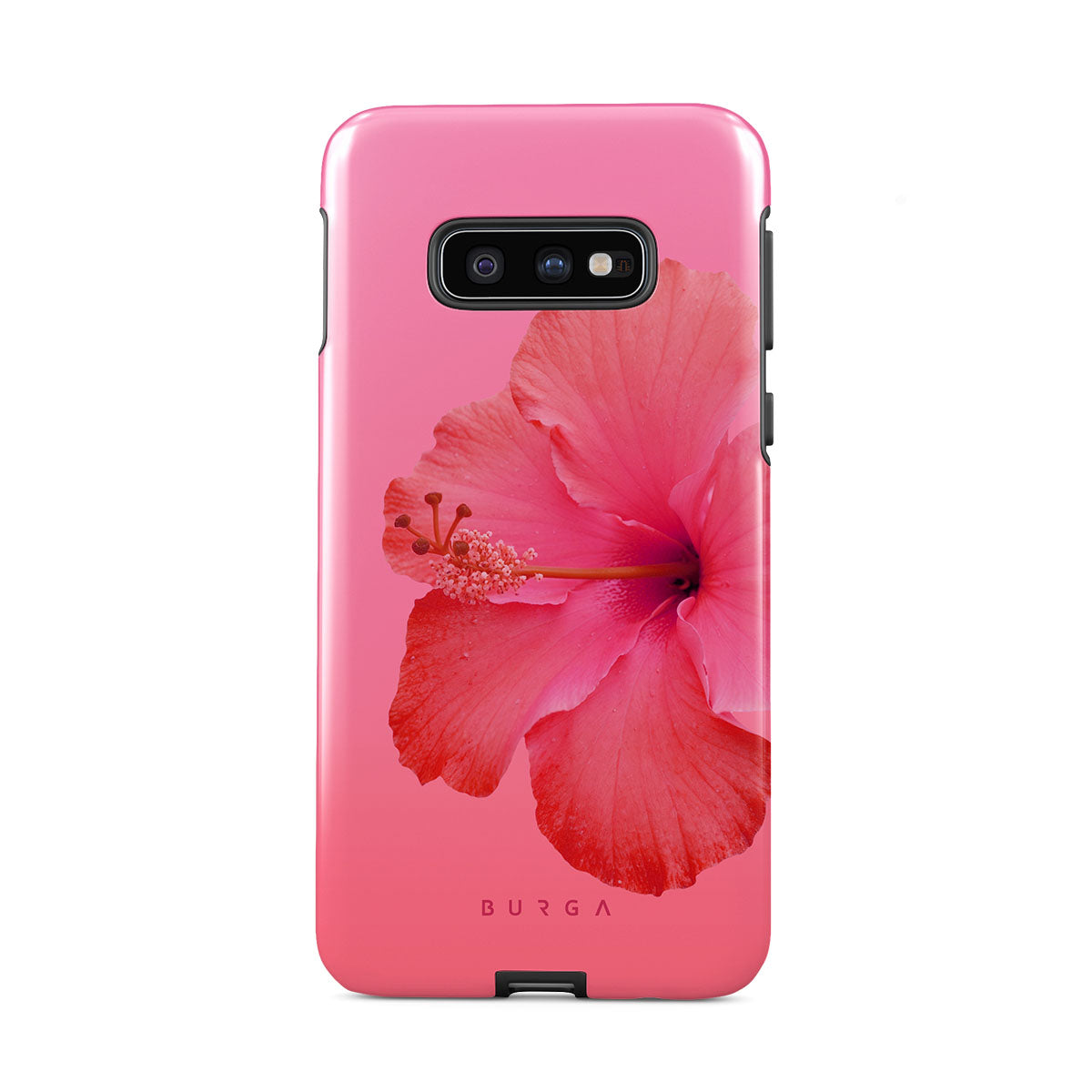 Our Island Girl Samsung Galaxy S10E phone case design bursts with the fiery red of a hibiscus in full bloom against a dreamy pink backdrop. Perfect for those who embody the spirit of a sun-kissed island retreat.