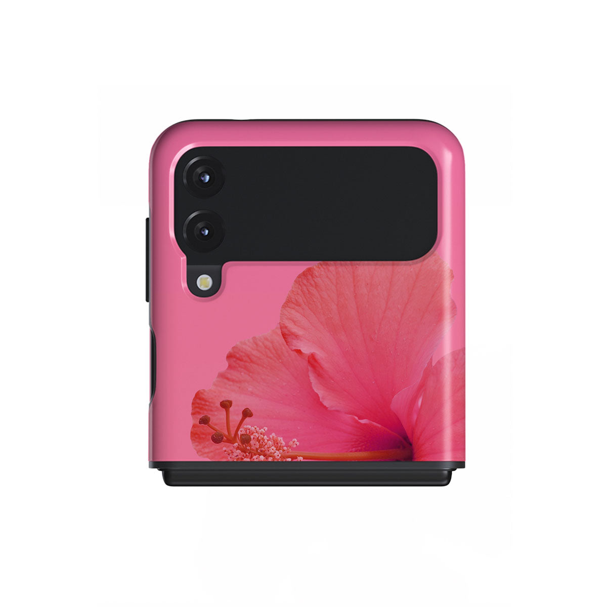Our Island Girl Samsung Galaxy Z Flip 3 phone case design bursts with the fiery red of a hibiscus in full bloom against a dreamy pink backdrop. Perfect for those who embody the spirit of a sun-kissed island retreat.