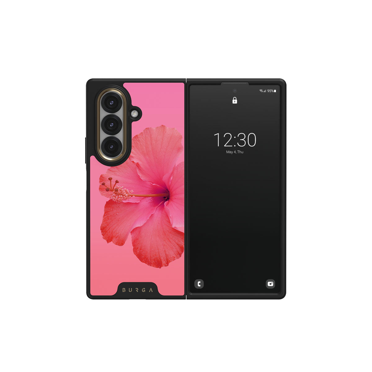 Our Island Girl Samsung Galaxy Z Fold 7 phone case design bursts with the fiery red of a hibiscus in full bloom against a dreamy pink backdrop. Perfect for those who embody the spirit of a sun-kissed island retreat.