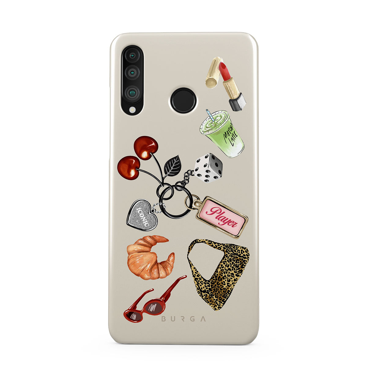 This design features: red sunglasses, red lipstick, green matcha drink, croissant, black dice, leopard-print bag, keychain with silver heart, cherries, dice and "Player" tag