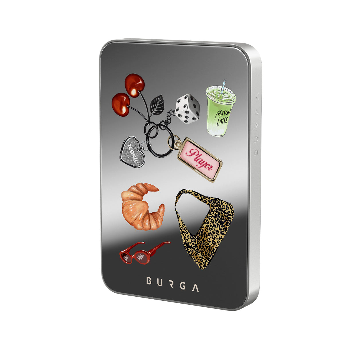 This design features: red sunglasses, red lipstick, green matcha drink, croissant, black dice, leopard-print bag, keychain with silver heart, cherries, dice and "Player" tag