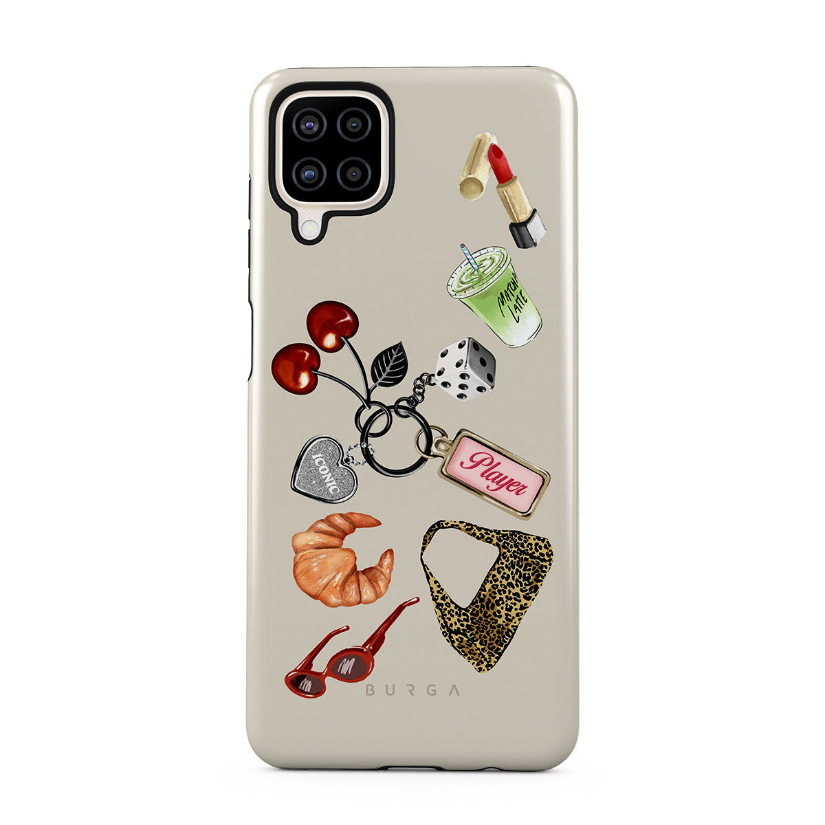 This design features: red sunglasses, red lipstick, green matcha drink, croissant, black dice, leopard-print bag, keychain with silver heart, cherries, dice and "Player" tag