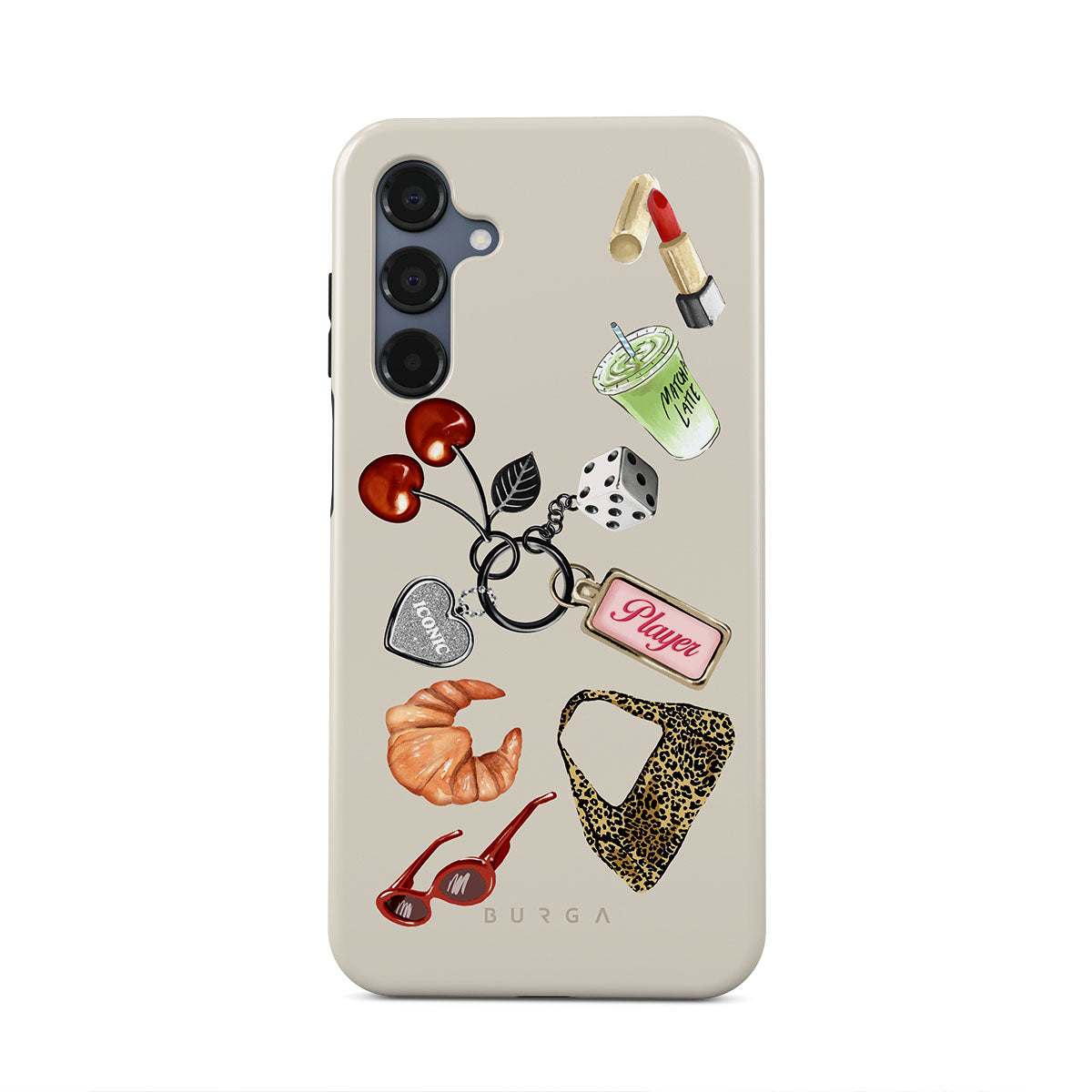 This design features: red sunglasses, red lipstick, green matcha drink, croissant, black dice, leopard-print bag, keychain with silver heart, cherries, dice and "Player" tag