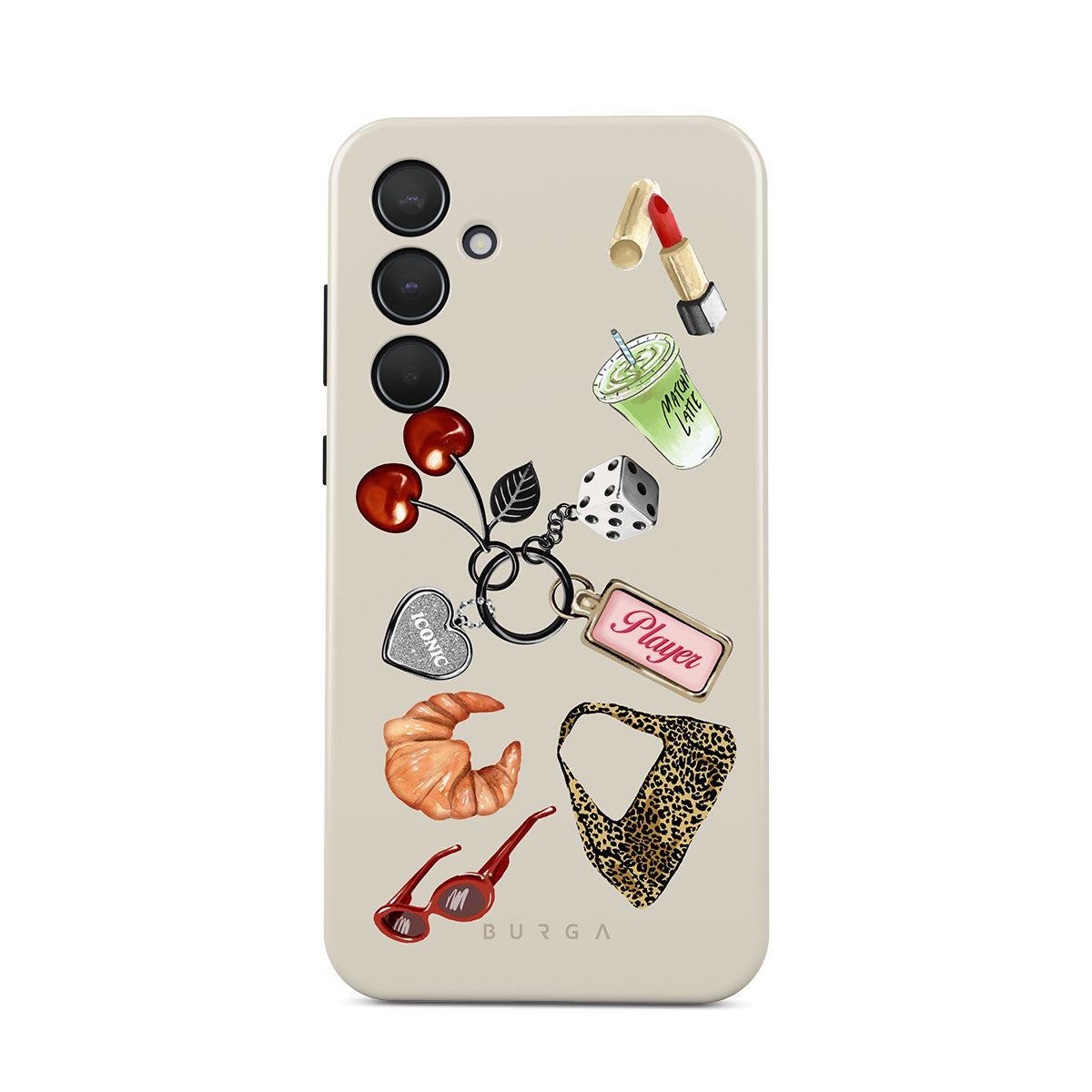 This design features: red sunglasses, red lipstick, green matcha drink, croissant, black dice, leopard-print bag, keychain with silver heart, cherries, dice and "Player" tag