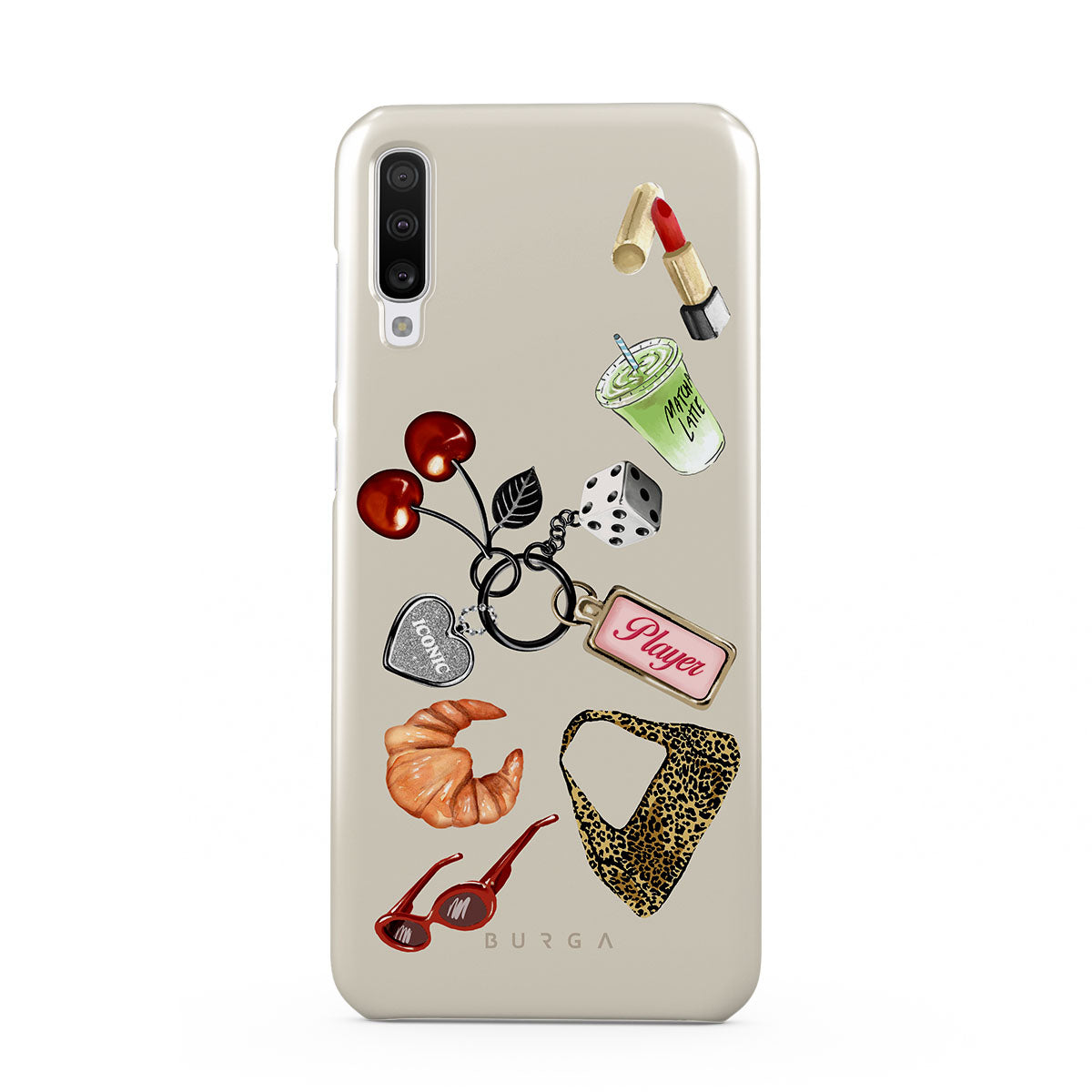 This design features: red sunglasses, red lipstick, green matcha drink, croissant, black dice, leopard-print bag, keychain with silver heart, cherries, dice and "Player" tag