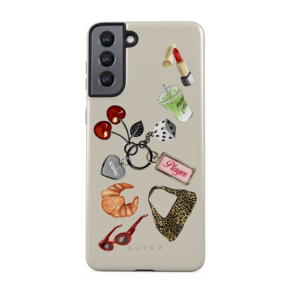This design features: red sunglasses, red lipstick, green matcha drink, croissant, black dice, leopard-print bag, keychain with silver heart, cherries, dice and "Player" tag