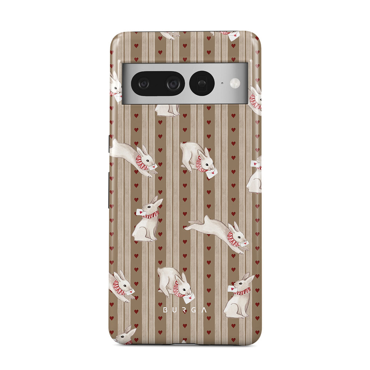 The Late Again Google Pixel 7 Pro phone case design is a love letter lost in time—scattered hearts, hurried notes, and white rabbits racing against a clock that refuses to be tamed. Sent, but never received. Read, but never answered. Always running, always chasing, always just a moment too late.