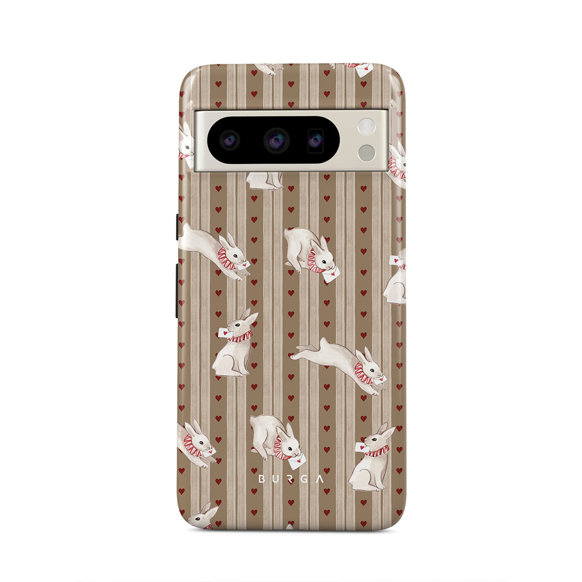 The Late Again Google Pixel 8 Pro phone case design is a love letter lost in time—scattered hearts, hurried notes, and white rabbits racing against a clock that refuses to be tamed. Sent, but never received. Read, but never answered. Always running, always chasing, always just a moment too late.