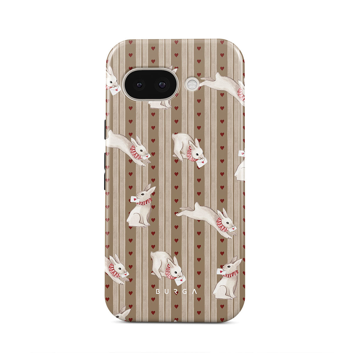 The Late Again Google Pixel 9a phone case design is a love letter lost in time—scattered hearts, hurried notes, and white rabbits racing against a clock that refuses to be tamed. Sent, but never received. Read, but never answered. Always running, always chasing, always just a moment too late.