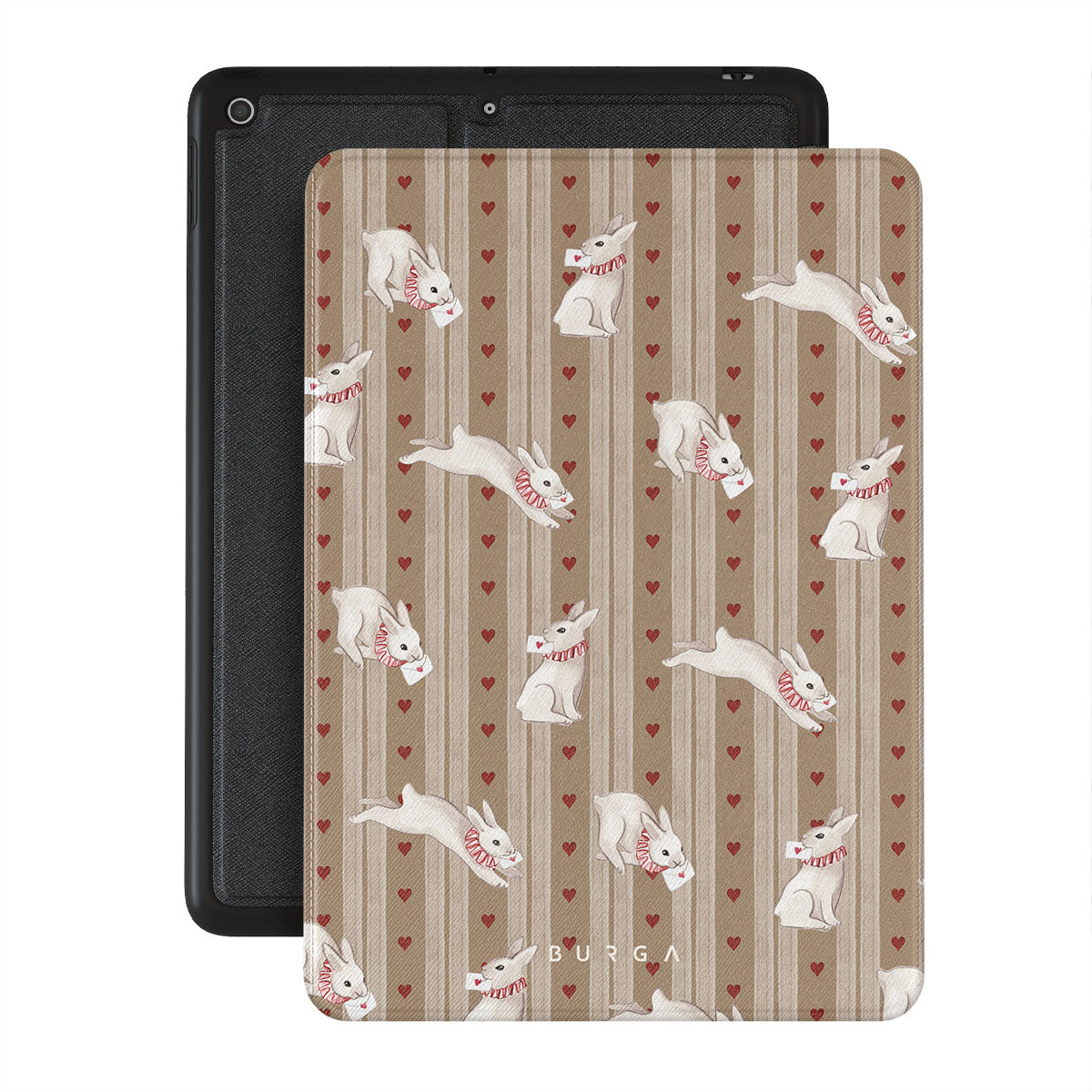 This design features: white rabbits, hearts, love, letters, vintage stripes