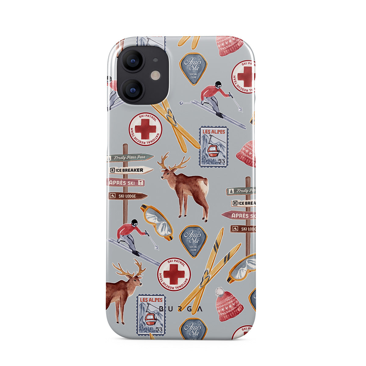 A vintage ski poster straight from your dad's college dorm. A iPhone 12 Mini phone case design dripping with nostalgia.