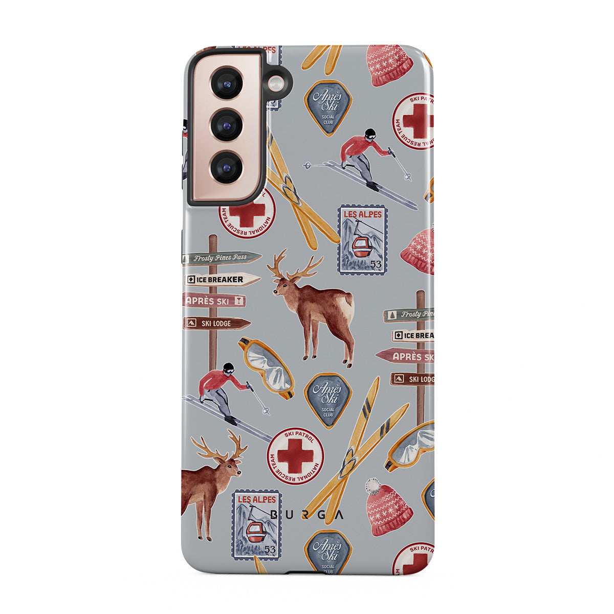 A vintage ski poster straight from your dad's college dorm. A Samsung Galaxy S21 Plus phone case design dripping with nostalgia.