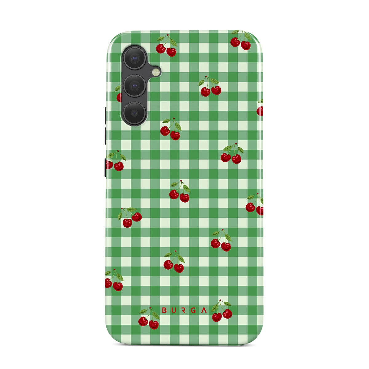The Little Life Samsung Galaxy A34 phone case design: green checks, simple and true, like a patch of grass under a tree, where you can sit and watch the small world go by, every leaf a chapter in nature’s story.
