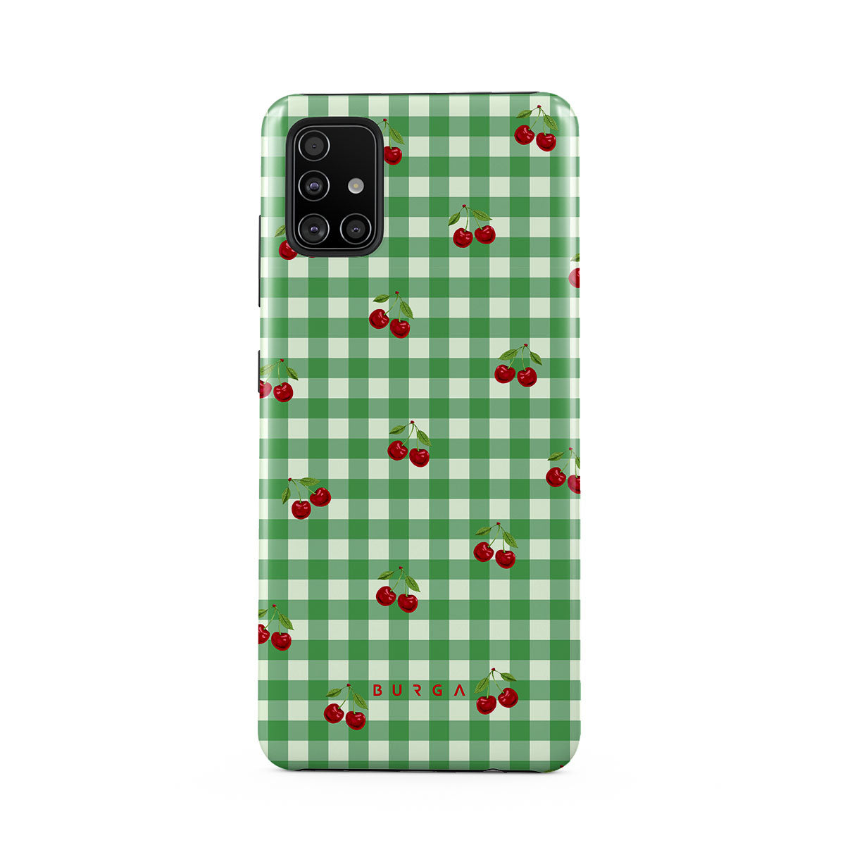 The Little Life Samsung Galaxy A71 4G phone case design: green checks, simple and true, like a patch of grass under a tree, where you can sit and watch the small world go by, every leaf a chapter in nature’s story.