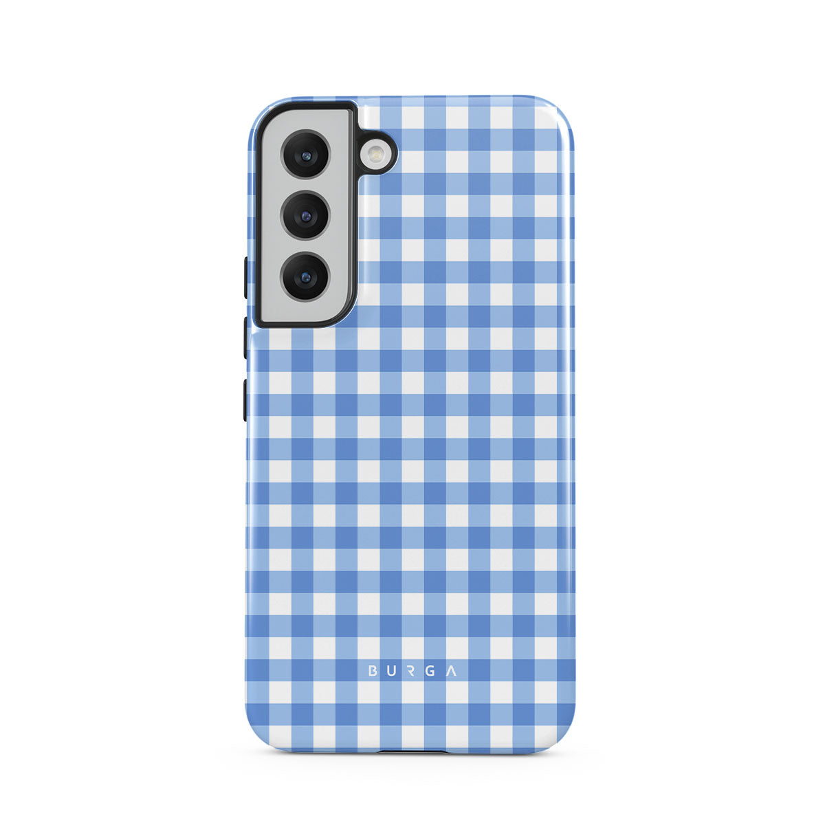 Crisp blue checks are your invitation to lay on the grass, look up at the sky, and find shapes in the clouds—simple joys that make any day lovely. That’s our Lovely Day Samsung Galaxy S22 Plus phone case design.