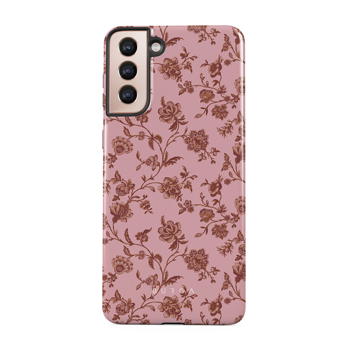 The Lover Samsung Galaxy S21 Plus phone case design: because you're a Lover, not a fighter. Delicate floral motifs across a soft pink background capture the essence of timeless beauty and rustic elegance. Perfect for modern-day cowgirls with a vintage heart.