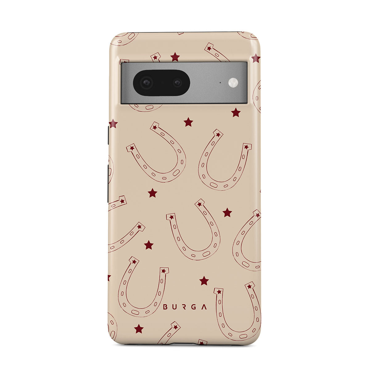 Horseshoes for luck, stars for style. Keep fortune on your side with our Lucky Charm Google Pixel 7a phone case. This design is a playful take on traditional symbols of luck. The earthy tones make it a versatile accessory for any western-inspired outfit—and not only.