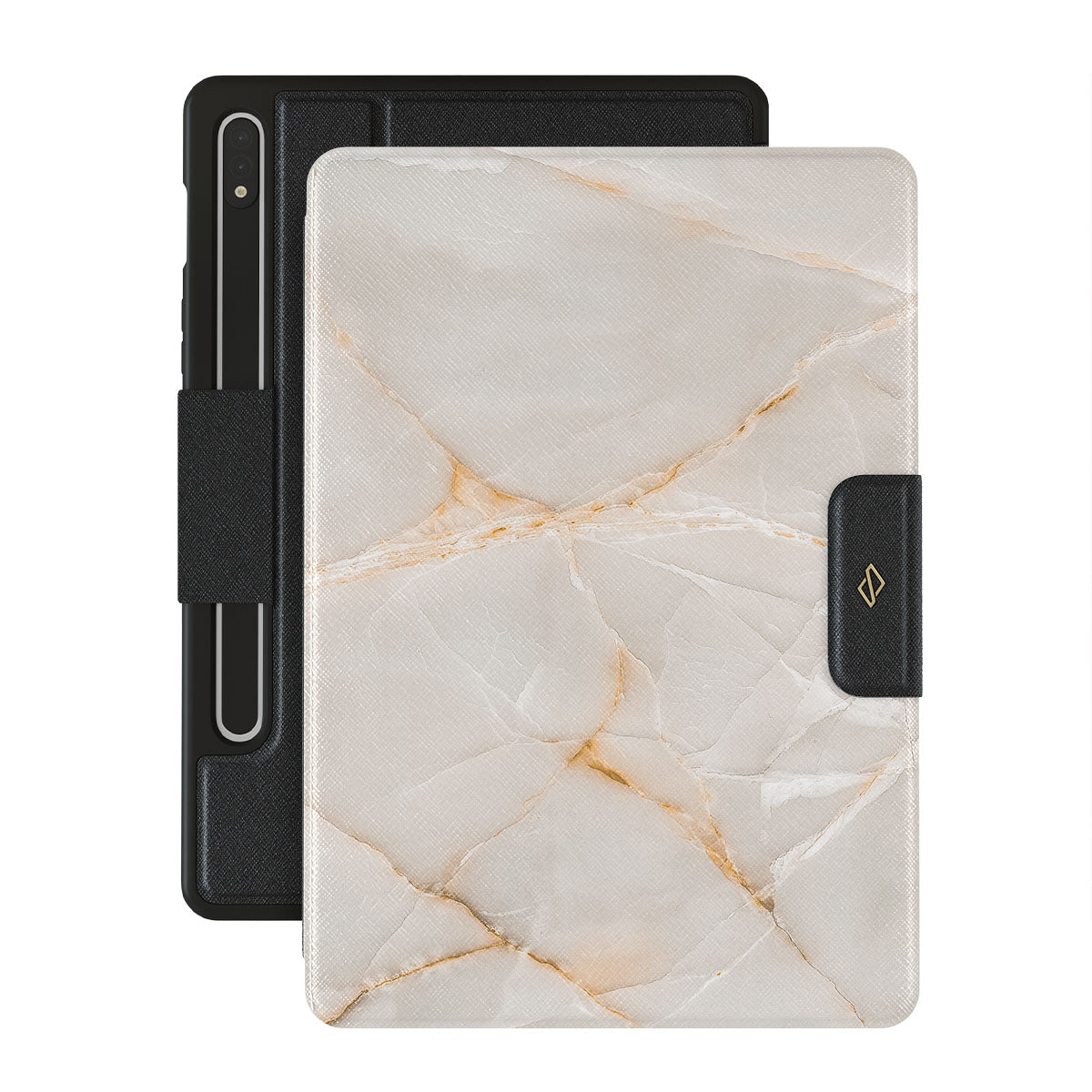 The Vanilla Sand Marble Samsung Galaxy Tab S9 FE folio case cover features a marble design with creamy canvas showcasing beautiful golden hues. The soft-toned case will add a touch of luxury to the device while protecting it from dangerous falls.