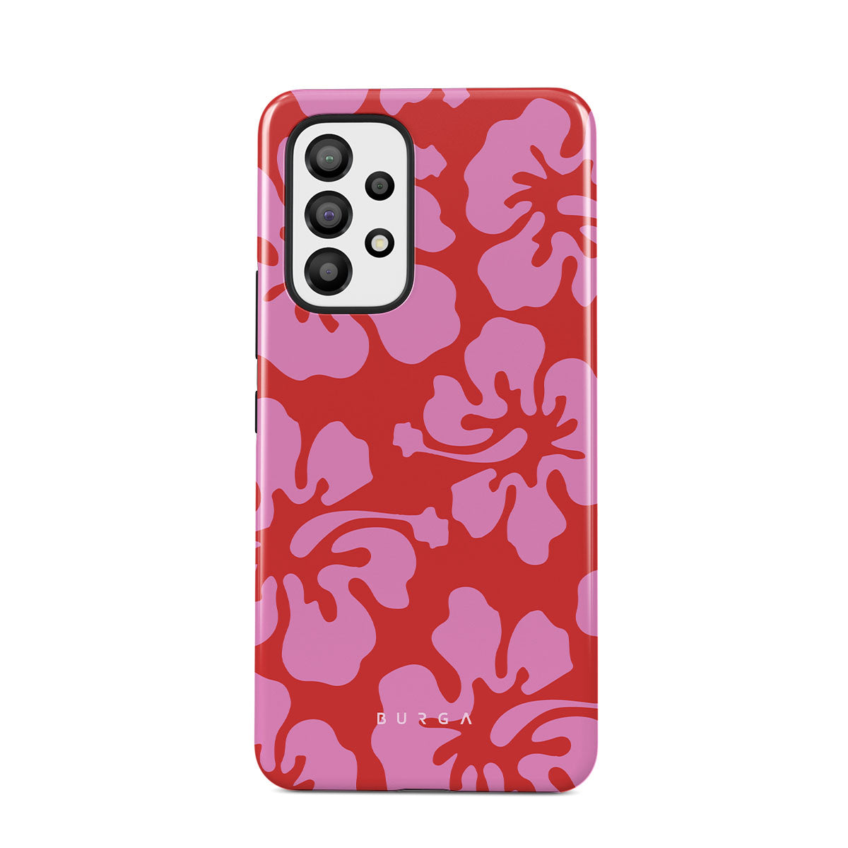 Dive into a sea of floral fantasy with Me Gustas Tu. Featuring oversized coral-toned blooms against a fiery backdrop, this Samsung Galaxy A53 phone case design captures the wild heart of tropical flowers—perfect for those who want to carry a touch of exotic flair.
