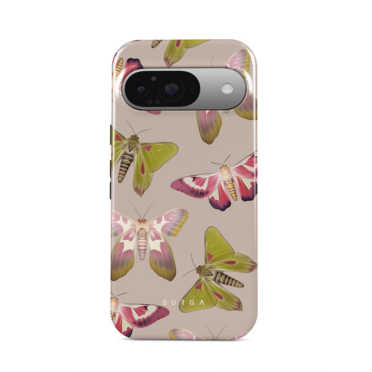 A tapestry of muted-toned moths — their wing patterns echoing tales of transformation and resilience found in nature's delicate beings. These moths, wings wide, serve as silent mentors, teaching us that every phase of life and change holds its own magic and mystery. Discover our Metamorphosis Google Pixel 9 phone casedesign.