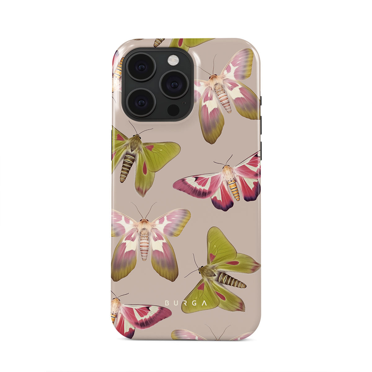 A tapestry of muted-toned moths — their wing patterns echoing tales of transformation and resilience found in nature's delicate beings. These moths, wings wide, serve as silent mentors, teaching us that every phase of life and change holds its own magic and mystery. Discover our Metamorphosis iPhone 15 Pro phone casedesign.