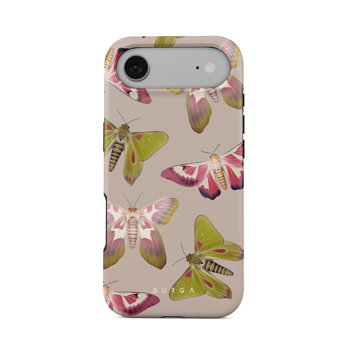 A tapestry of muted-toned moths — their wing patterns echoing tales of transformation and resilience found in nature's delicate beings. These moths, wings wide, serve as silent mentors, teaching us that every phase of life and change holds its own magic and mystery. Discover our Metamorphosis iPhone Air phone casedesign.