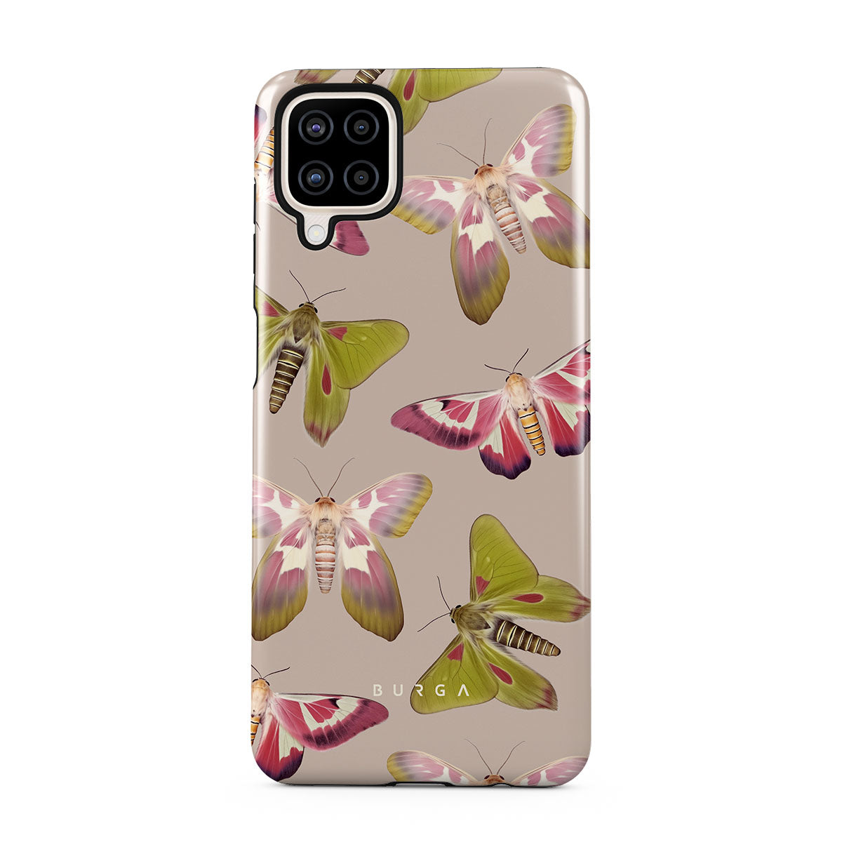 A tapestry of muted-toned moths — their wing patterns echoing tales of transformation and resilience found in nature's delicate beings. These moths, wings wide, serve as silent mentors, teaching us that every phase of life and change holds its own magic and mystery. Discover our Metamorphosis Samsung Galaxy A12 4G phone casedesign.
