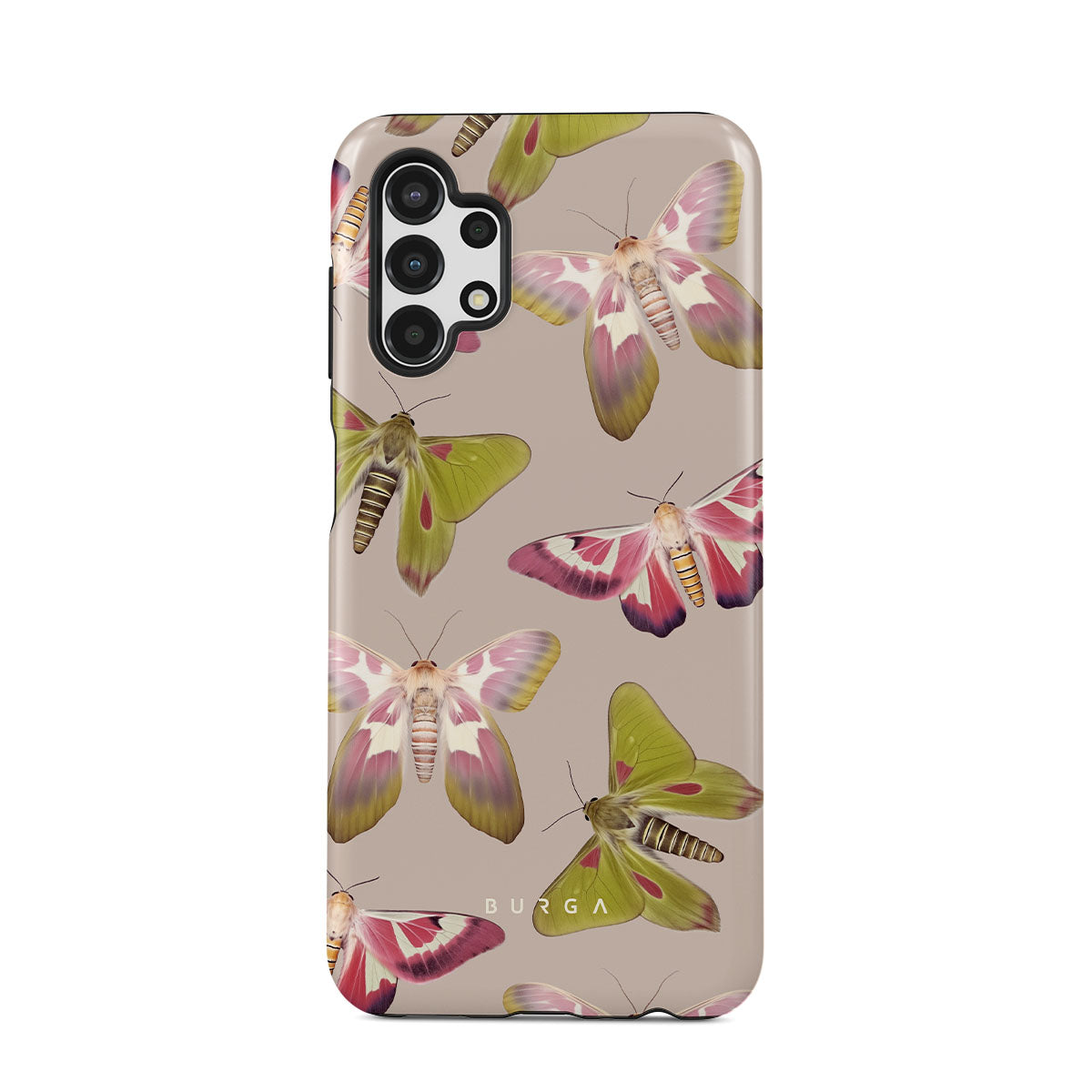 A tapestry of muted-toned moths — their wing patterns echoing tales of transformation and resilience found in nature's delicate beings. These moths, wings wide, serve as silent mentors, teaching us that every phase of life and change holds its own magic and mystery. Discover our Metamorphosis Samsung Galaxy A13 4G phone casedesign.