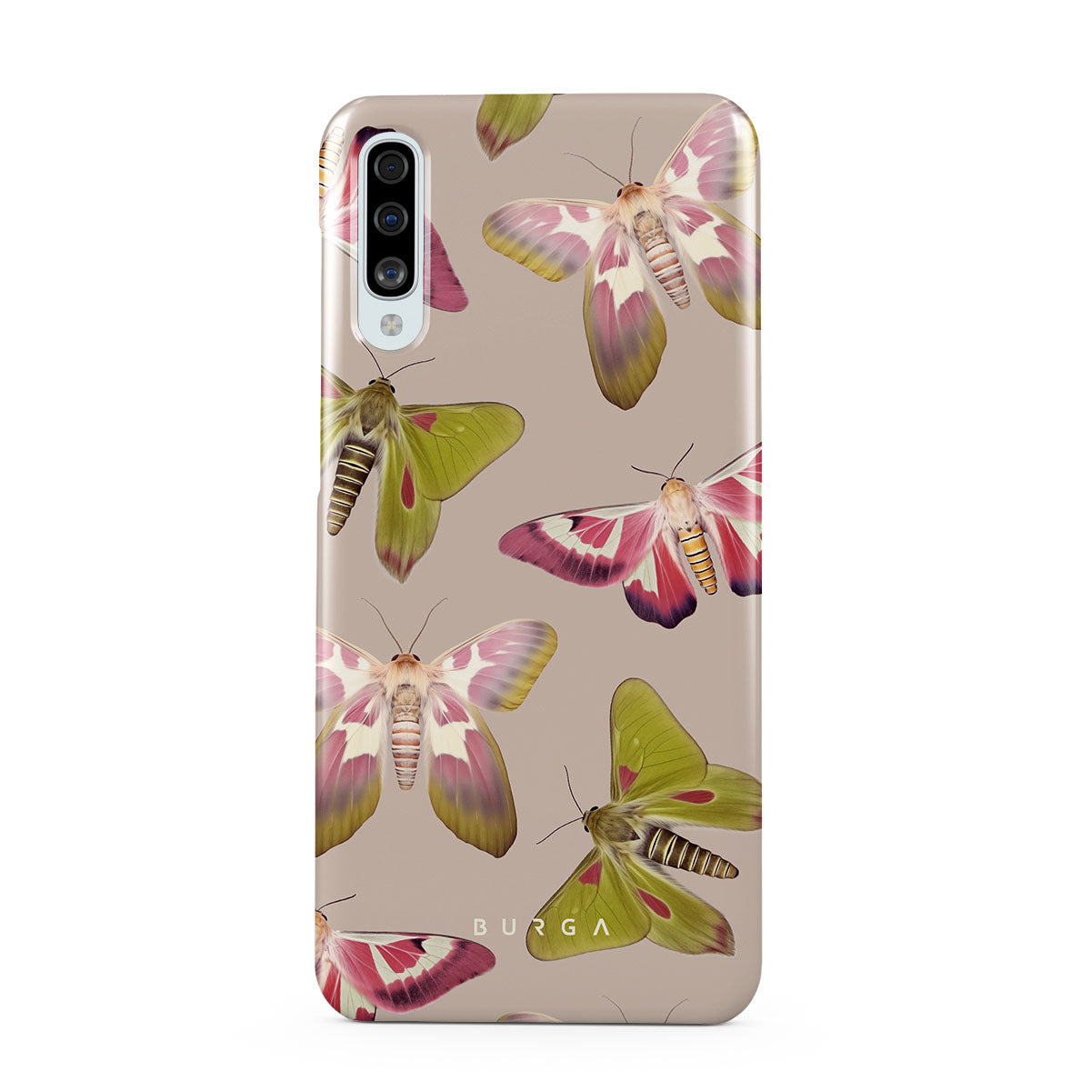A tapestry of muted-toned moths — their wing patterns echoing tales of transformation and resilience found in nature's delicate beings. These moths, wings wide, serve as silent mentors, teaching us that every phase of life and change holds its own magic and mystery. Discover our Metamorphosis Samsung Galaxy A50 phone casedesign.