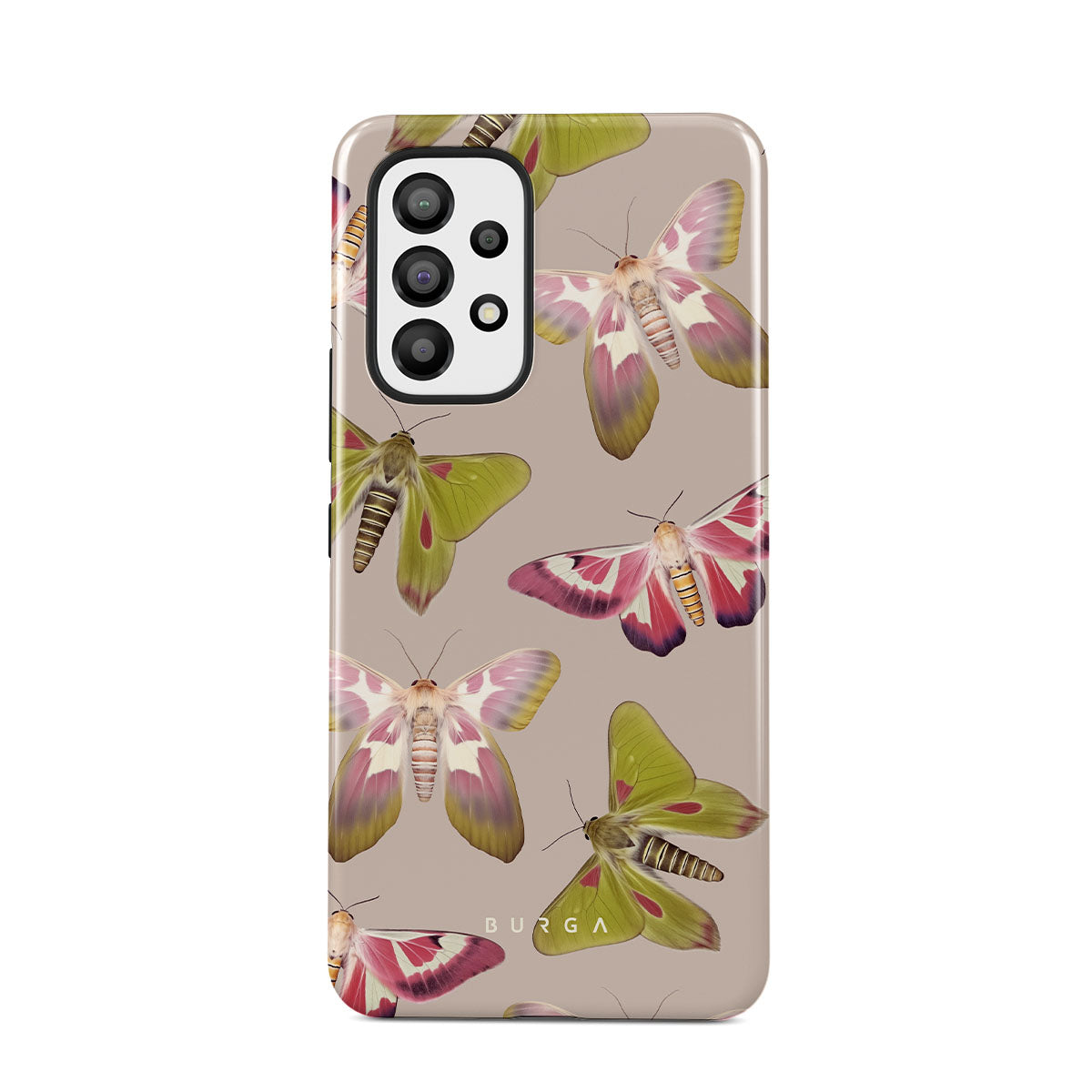 A tapestry of muted-toned moths — their wing patterns echoing tales of transformation and resilience found in nature's delicate beings. These moths, wings wide, serve as silent mentors, teaching us that every phase of life and change holds its own magic and mystery. Discover our Metamorphosis Samsung Galaxy A53 phone casedesign.