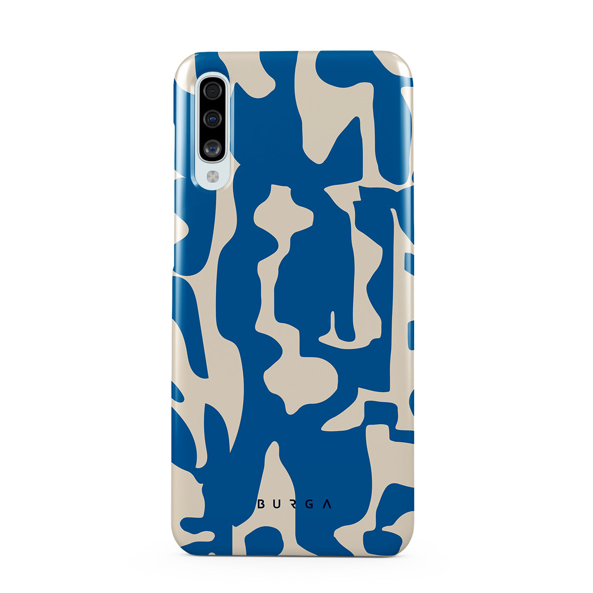 Indulge in the exquisite elegance of Mirage. Against a canvas of deep, enigmatic blue, luminous shapes gracefully disrupt the darkness, creating a captivating visual spectacle. Let this Samsung Galaxy A50 phone case be a symbol of your impeccable taste and magnetic charm.