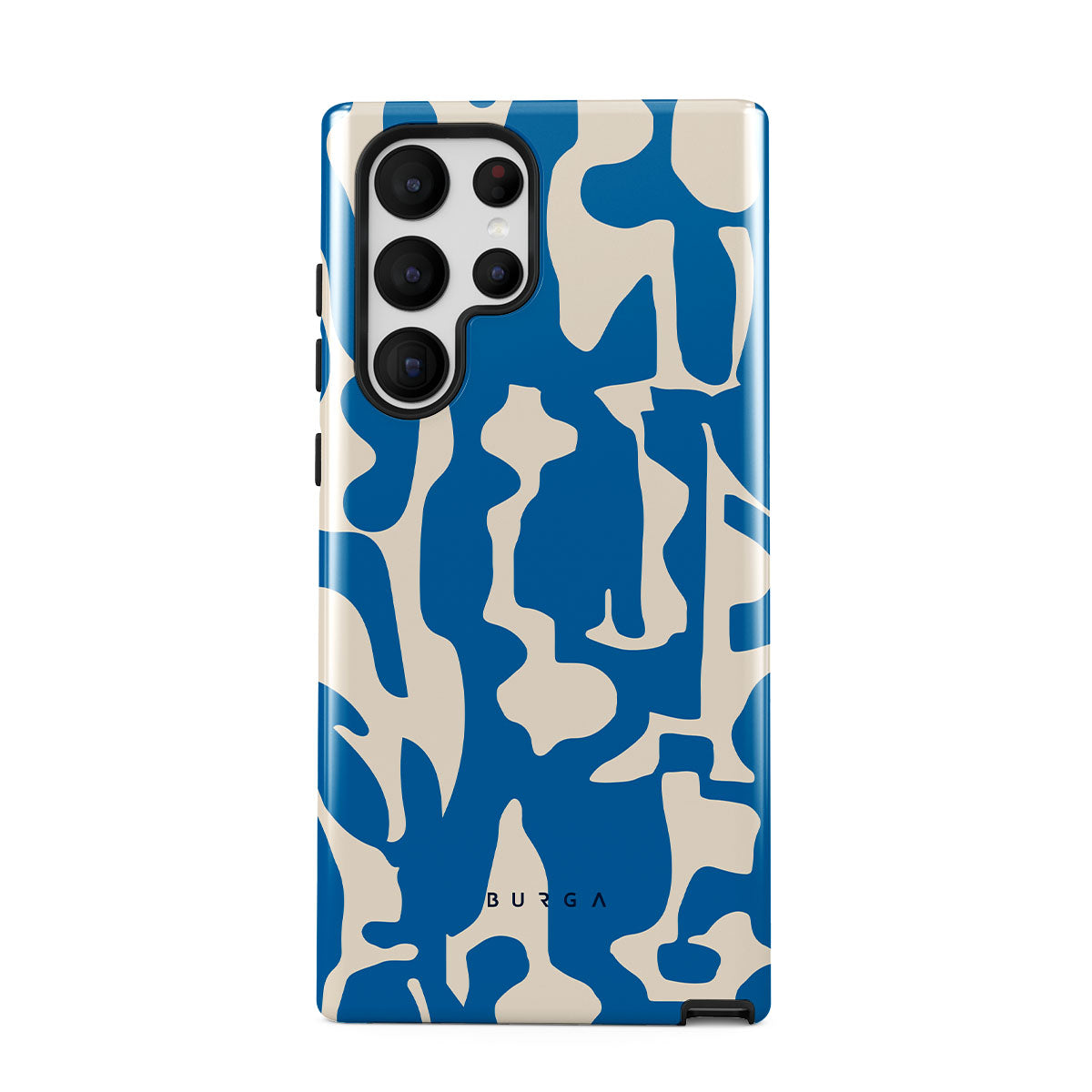 Indulge in the exquisite elegance of Mirage. Against a canvas of deep, enigmatic blue, luminous shapes gracefully disrupt the darkness, creating a captivating visual spectacle. Let this Samsung Galaxy S22 Ultra phone case be a symbol of your impeccable taste and magnetic charm.