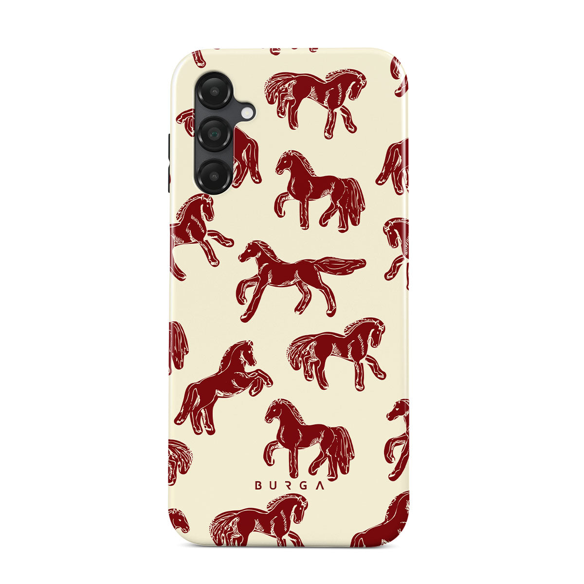 It's time to unleash your wild side with the Mustang design. Bold red horses gallop across a nude background, capturing the spirit of untamed adventure. This Samsung Galaxy A25 phone case is perfect for the free-spirited souls ready to ride into the unknown.