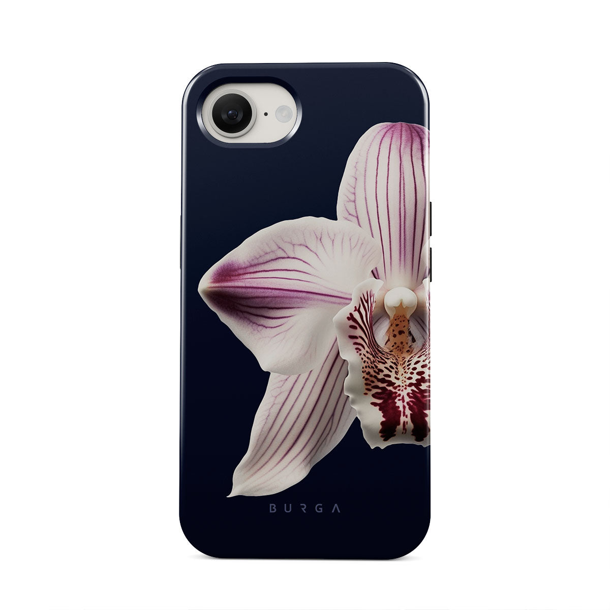 The white orchid blooms boldly upon a night sky blue, a beacon of clarity in the darkness. Our Nectar iPhone 16e phone case design speaks to the soul's desire to find light within, to illuminate the hidden paths of self-discovery that only reveal themselves under the cloak of introspection.