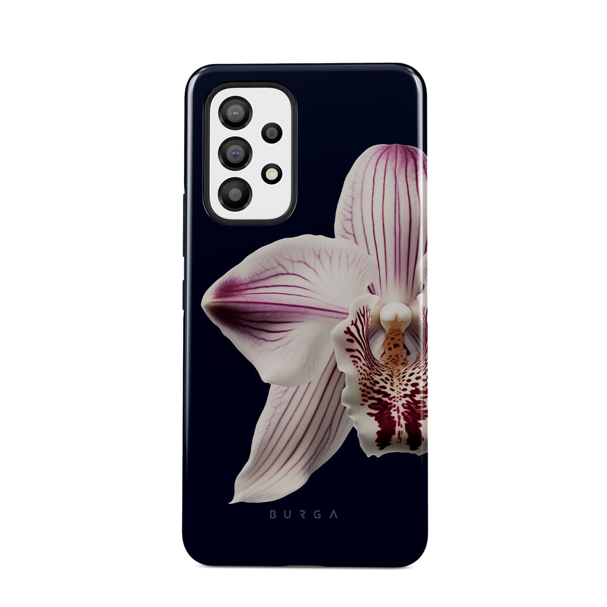 The white orchid blooms boldly upon a night sky blue, a beacon of clarity in the darkness. Our Nectar Samsung Galaxy A33 phone case design speaks to the soul's desire to find light within, to illuminate the hidden paths of self-discovery that only reveal themselves under the cloak of introspection.