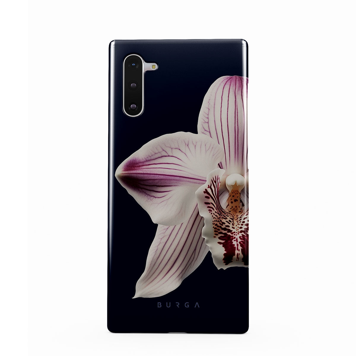 The white orchid blooms boldly upon a night sky blue, a beacon of clarity in the darkness. Our Nectar Samsung Galaxy Note 10 phone case design speaks to the soul's desire to find light within, to illuminate the hidden paths of self-discovery that only reveal themselves under the cloak of introspection.