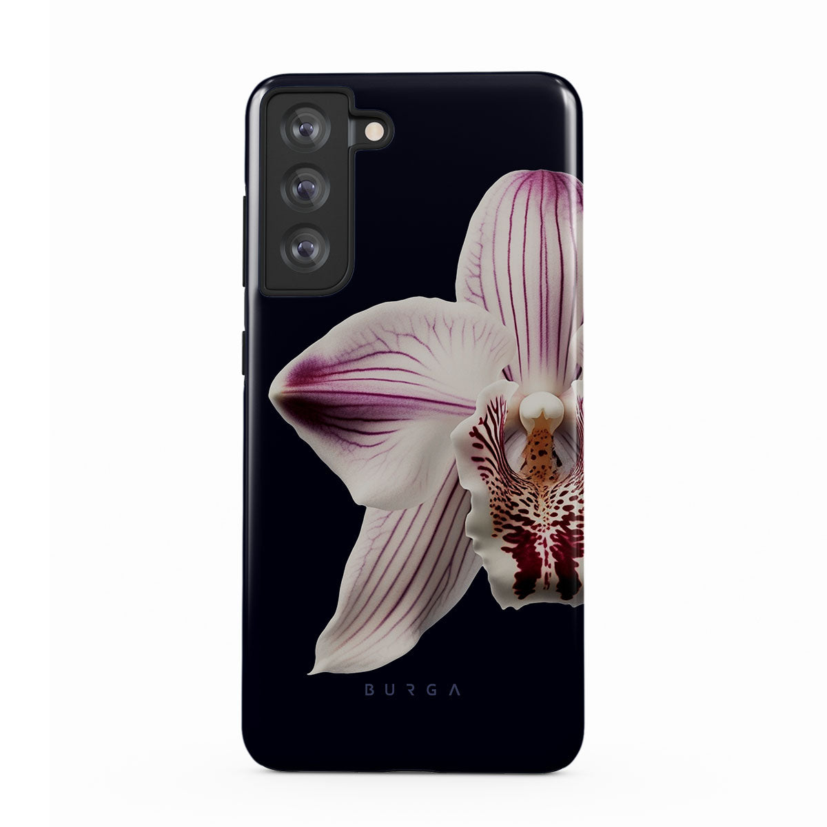 The white orchid blooms boldly upon a night sky blue, a beacon of clarity in the darkness. Our Nectar Samsung Galaxy S21 FE phone case design speaks to the soul's desire to find light within, to illuminate the hidden paths of self-discovery that only reveal themselves under the cloak of introspection.