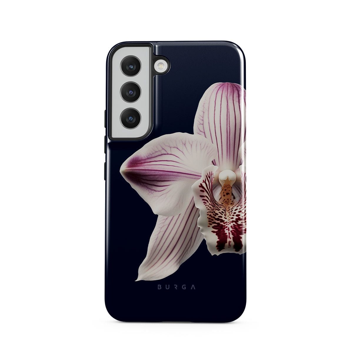 The white orchid blooms boldly upon a night sky blue, a beacon of clarity in the darkness. Our Nectar Samsung Galaxy S22 phone case design speaks to the soul's desire to find light within, to illuminate the hidden paths of self-discovery that only reveal themselves under the cloak of introspection.