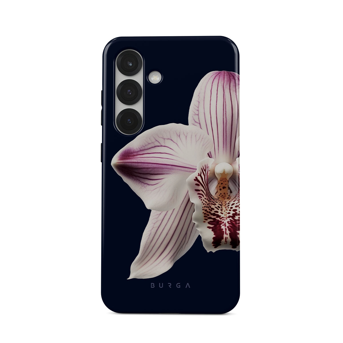 The white orchid blooms boldly upon a night sky blue, a beacon of clarity in the darkness. Our Nectar Samsung Galaxy S25 phone case design speaks to the soul's desire to find light within, to illuminate the hidden paths of self-discovery that only reveal themselves under the cloak of introspection.